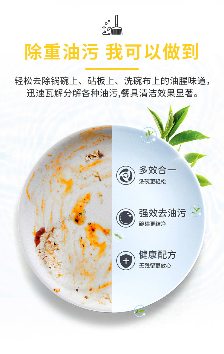 2.高效去污:快速乳化油渍,适合日常餐具及果蔬清洁;