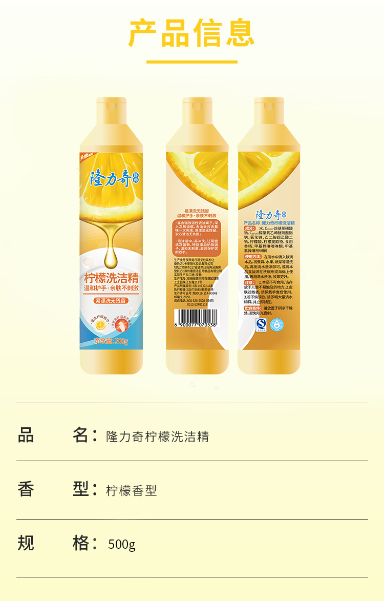 名称:隆力奇柠檬洗洁精 500g