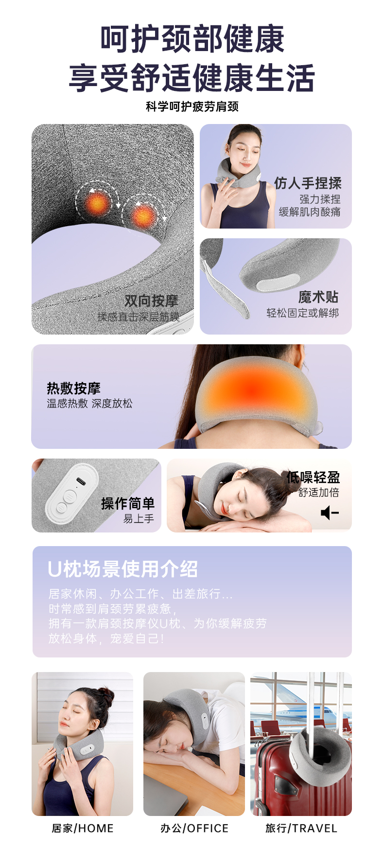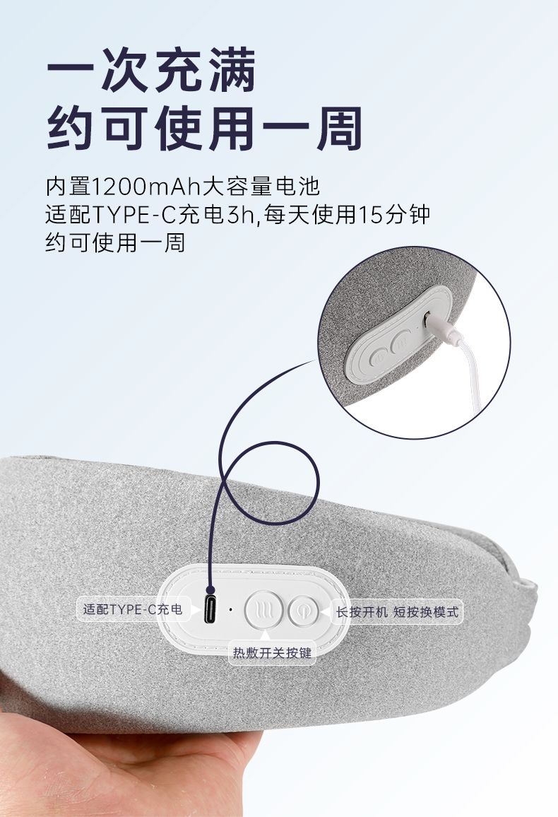 3,低噪音运行,安睡好眠; 4,内置1200毫安高效能电池,充电3小时,每次按摩15分钟,一周续航;