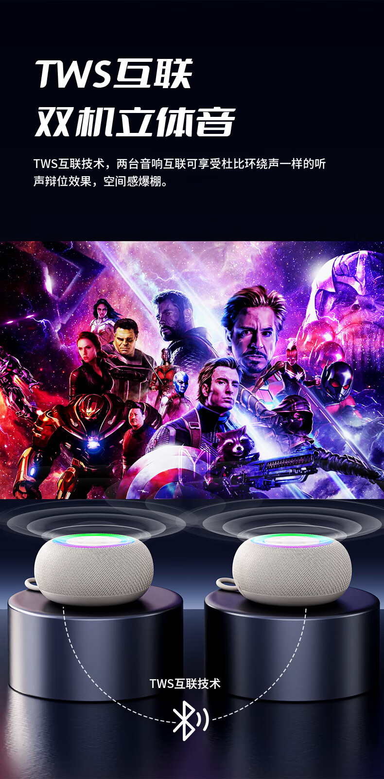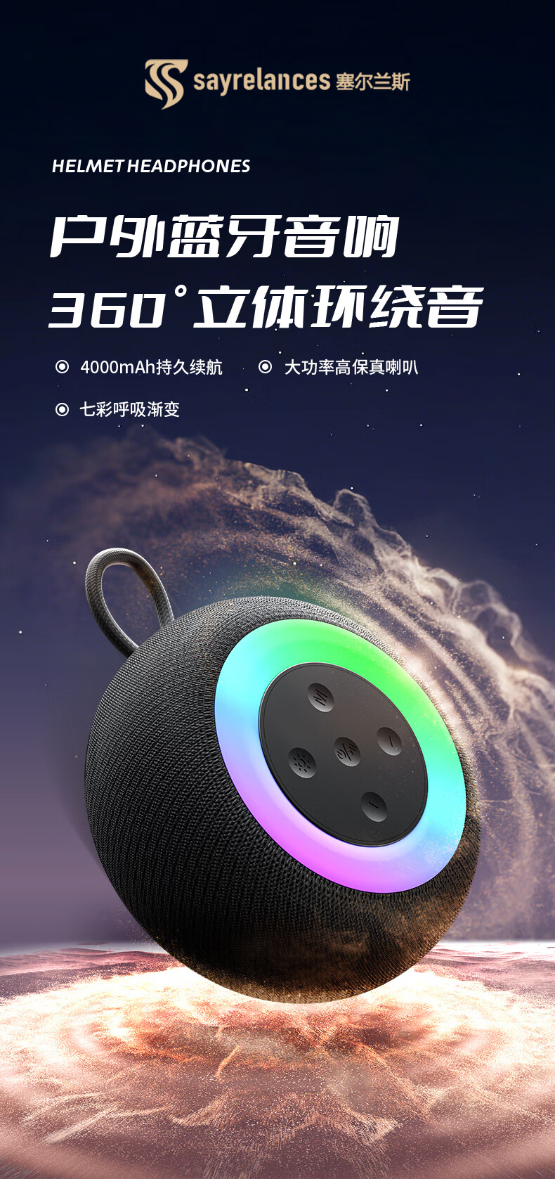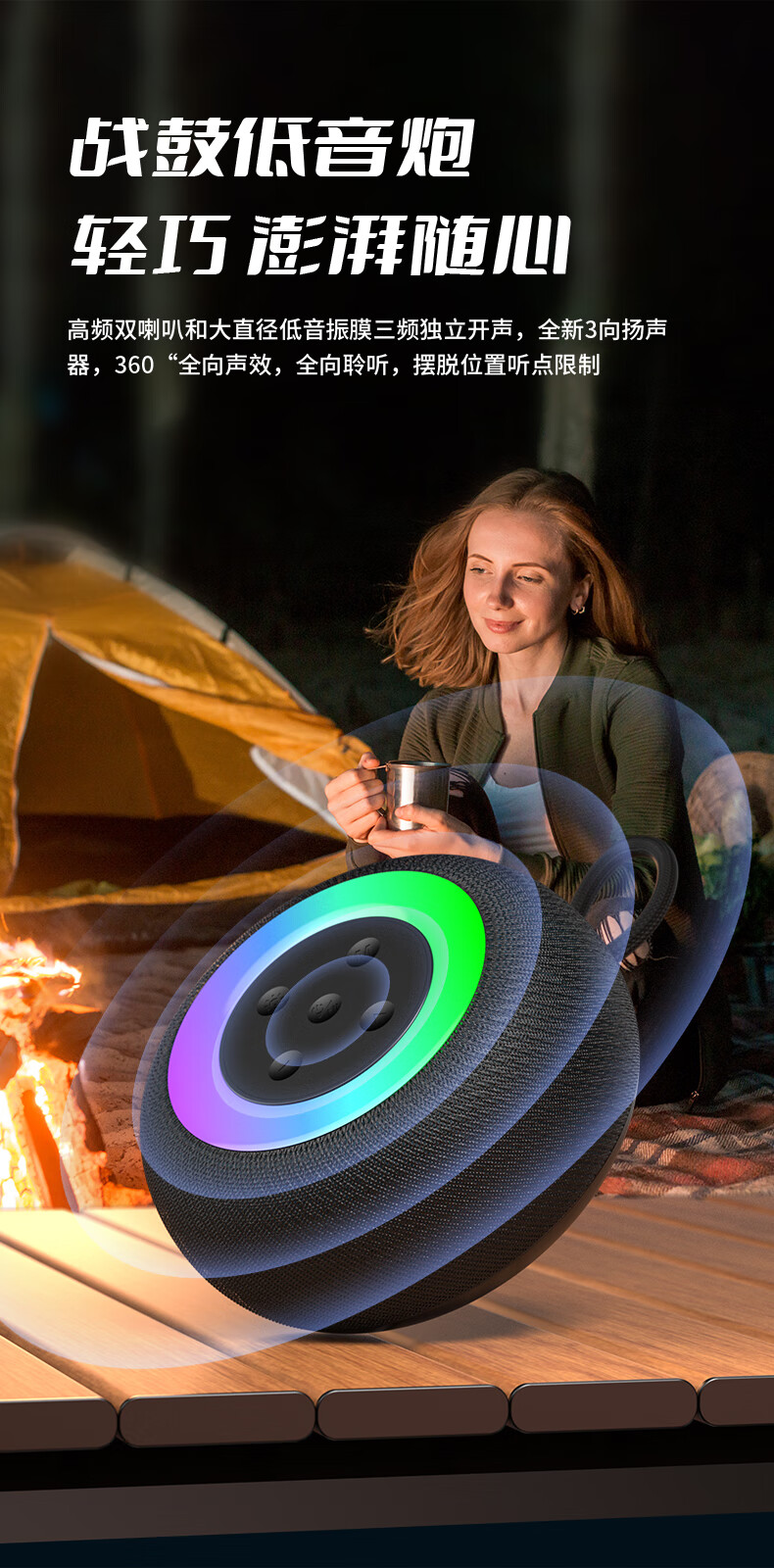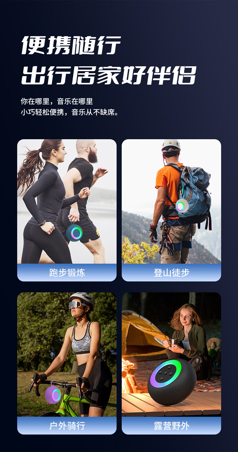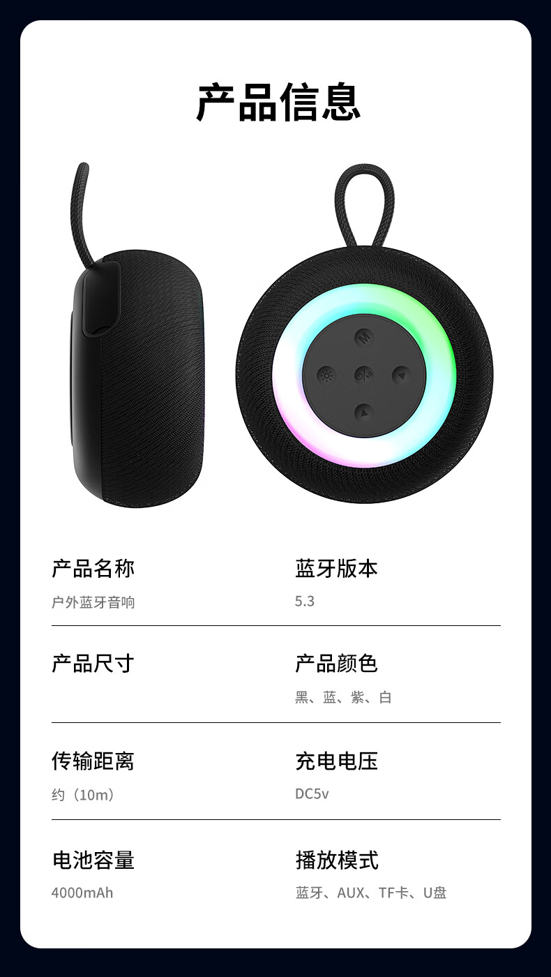 1,户外桌面音箱,16W大功率,震撼重低音振膜; 2,智能降噪高清通话; 3,TWS串联杜比环绕声,意思可两台同时连接。 4,LED七彩灯光环绕呼吸; 5,4000mAh持久10小时续航,防水防尘, 6,可以蓝牙播放,TF卡播放,AUX播放,U盘播放。