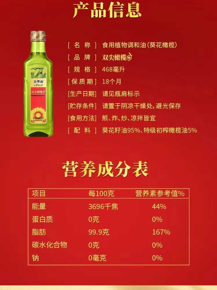 贝蒂斯食用植物调和油(葵花橄榄)468ml