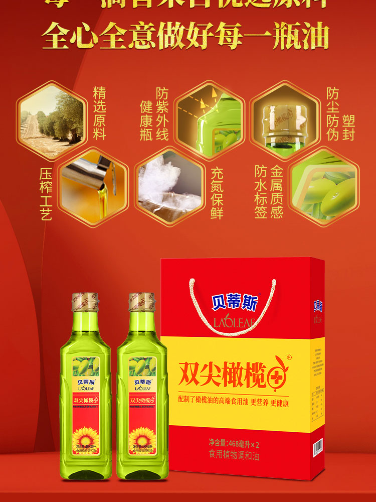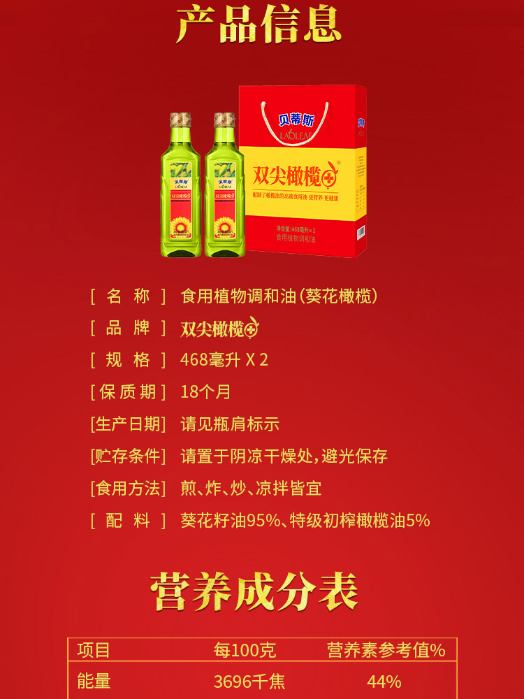 贝蒂斯食用植物调和油(葵花橄榄)468ML*2礼盒装
