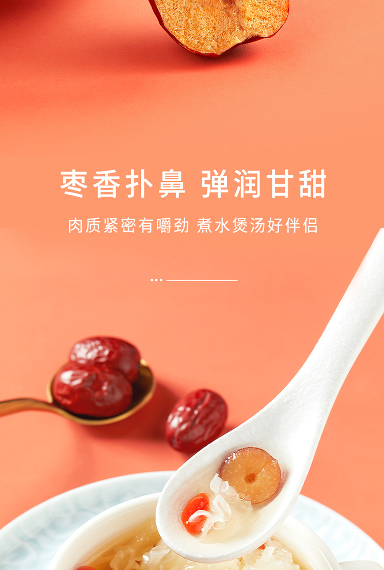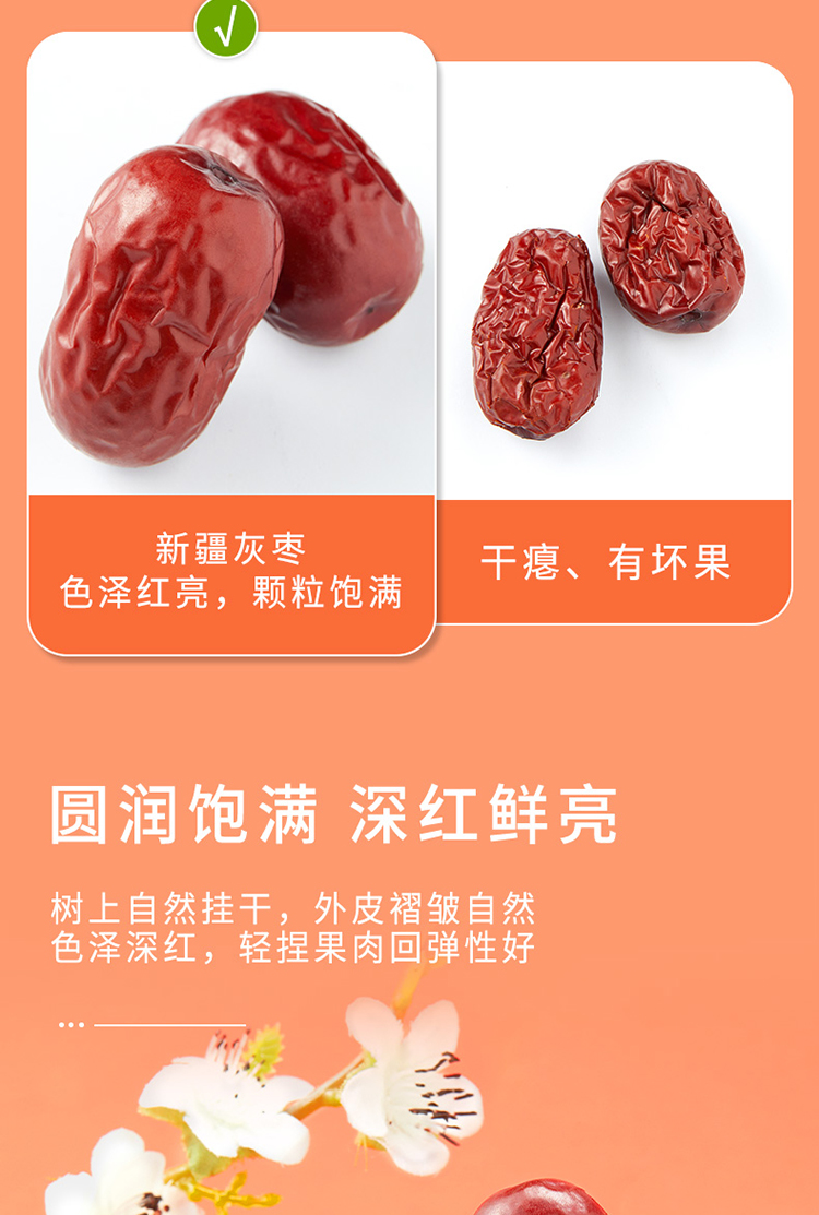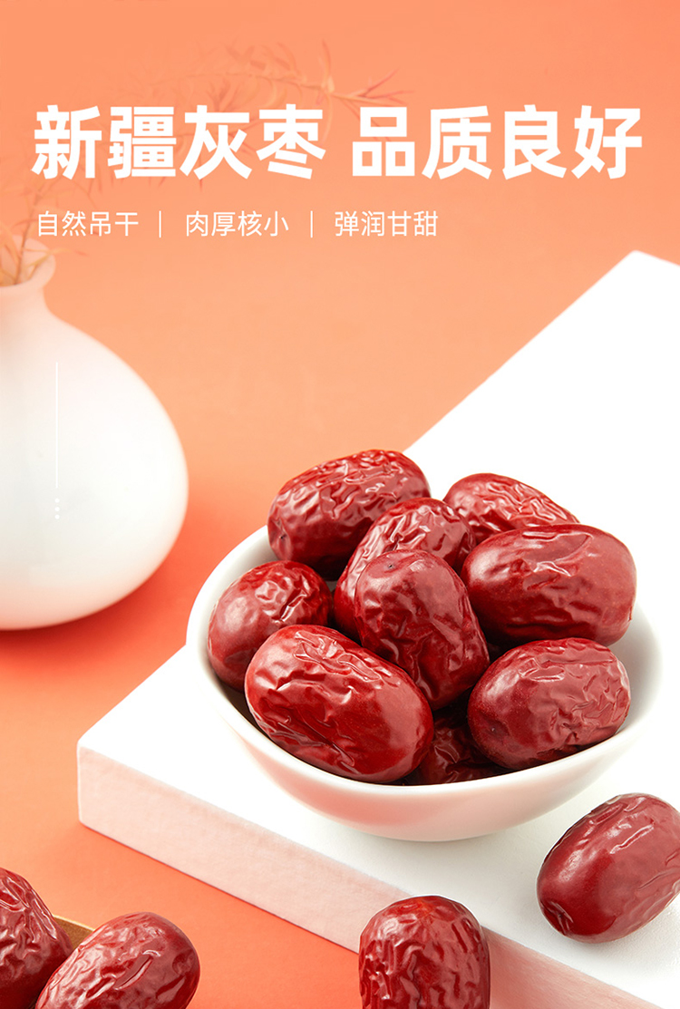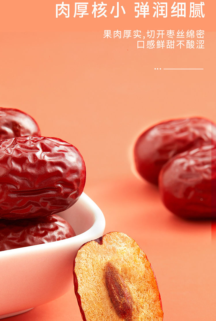 一等灰枣,自然吊干,肉厚核小,色泽红亮,圆润饱满,弹润甘甜,切开枣丝绵密,肉质紧密有嚼劲