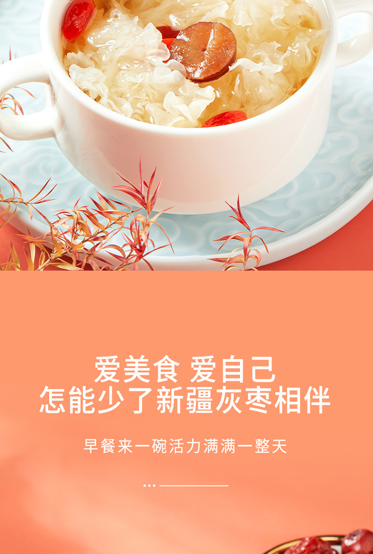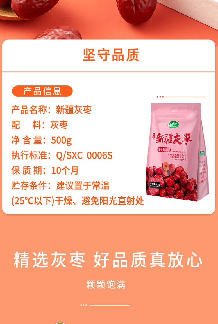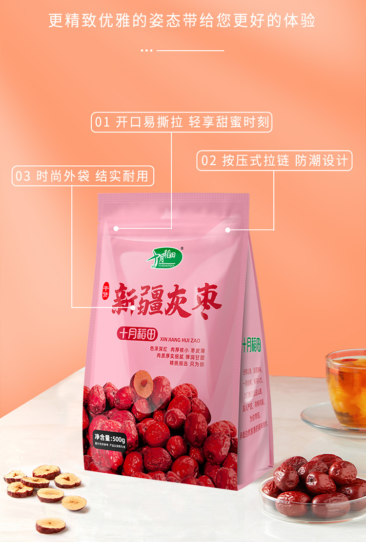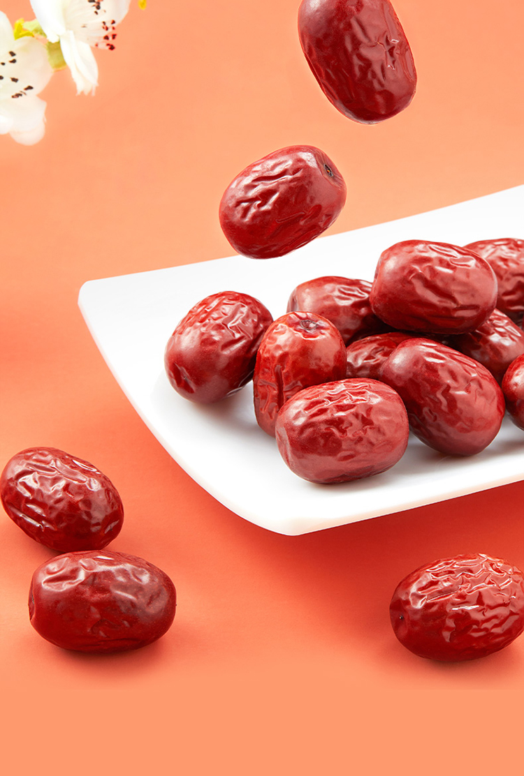 一等灰枣,自然吊干,肉厚核小,色泽红亮,圆润饱满,弹润甘甜,切开枣丝绵密,肉质紧密有嚼劲