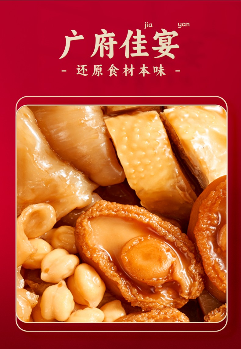 【广州酒家】海参(180-200头)、黄金鲍鱼(14-16克)、蟹鱼胶(30-40头)、帆立贝(40-60头)、卤鸭掌、鱼肉豆腐、仿龙虾丸、三黄鸡肉、花菇仔、莲藕、杏鲍菇、鹰嘴豆、鲍汁