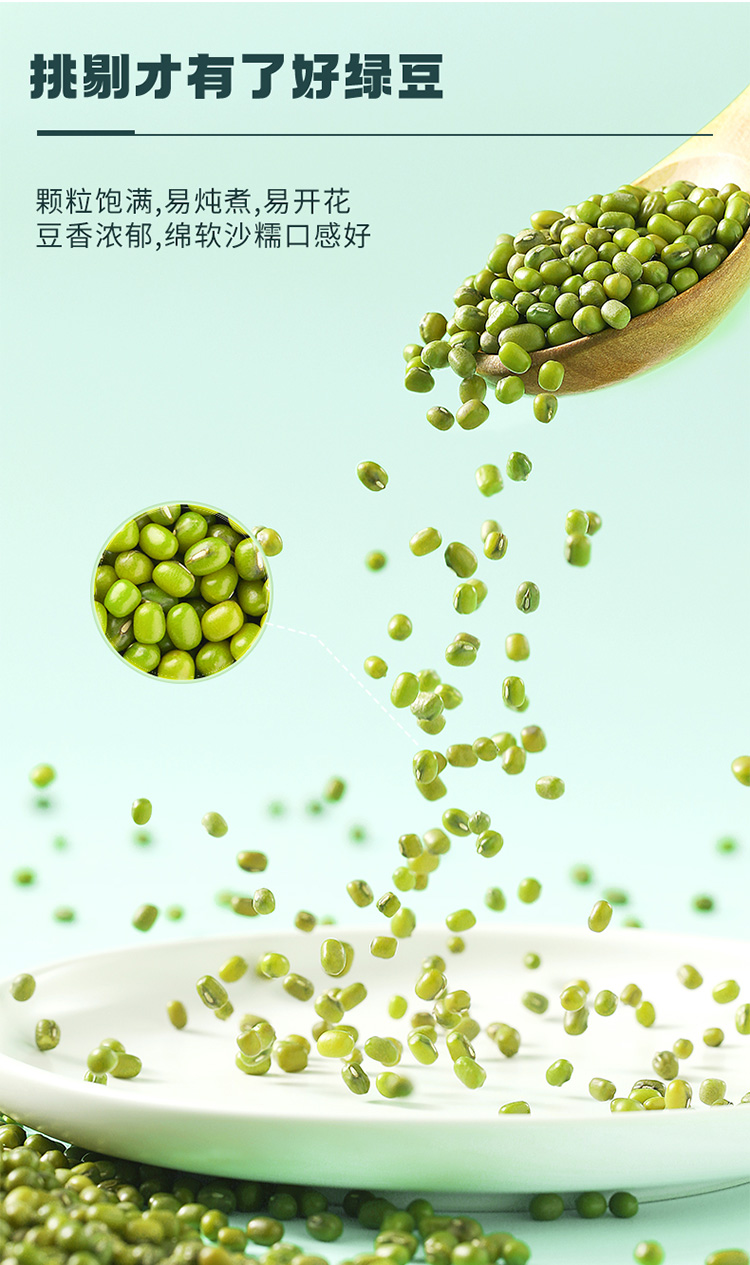 绿豆均匀饱满整齐度高,粒大皮薄易炖煮