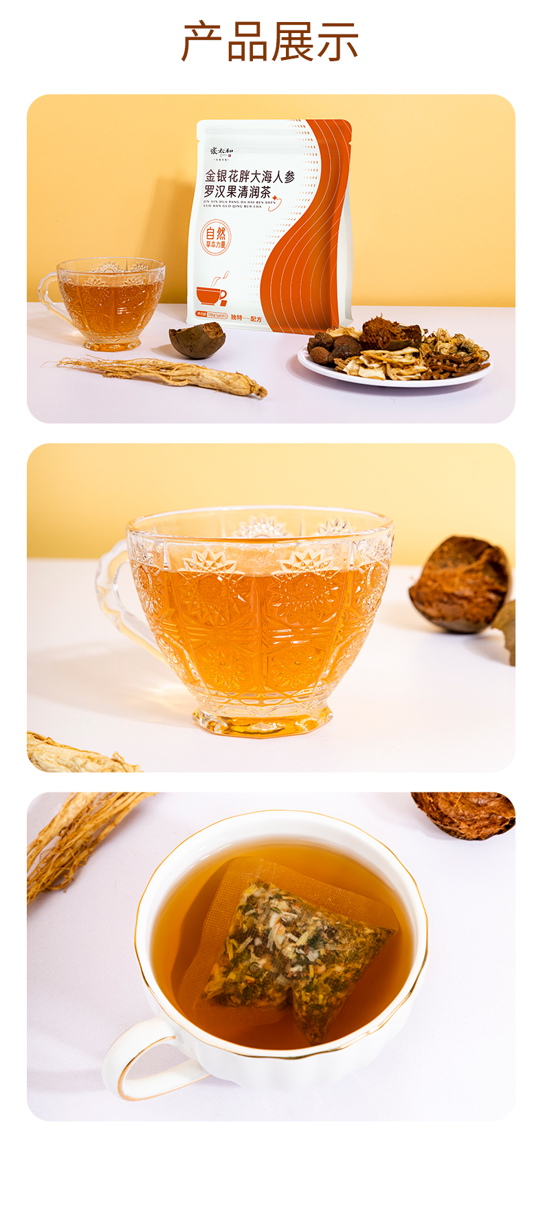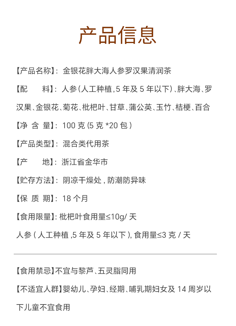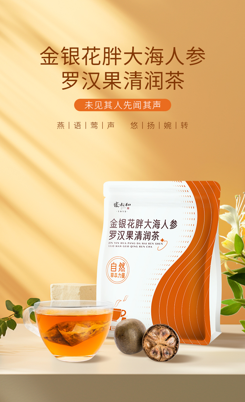 张太和 金银花胖大海人参罗汉果清润茶 100g(5g*20)/袋*2袋