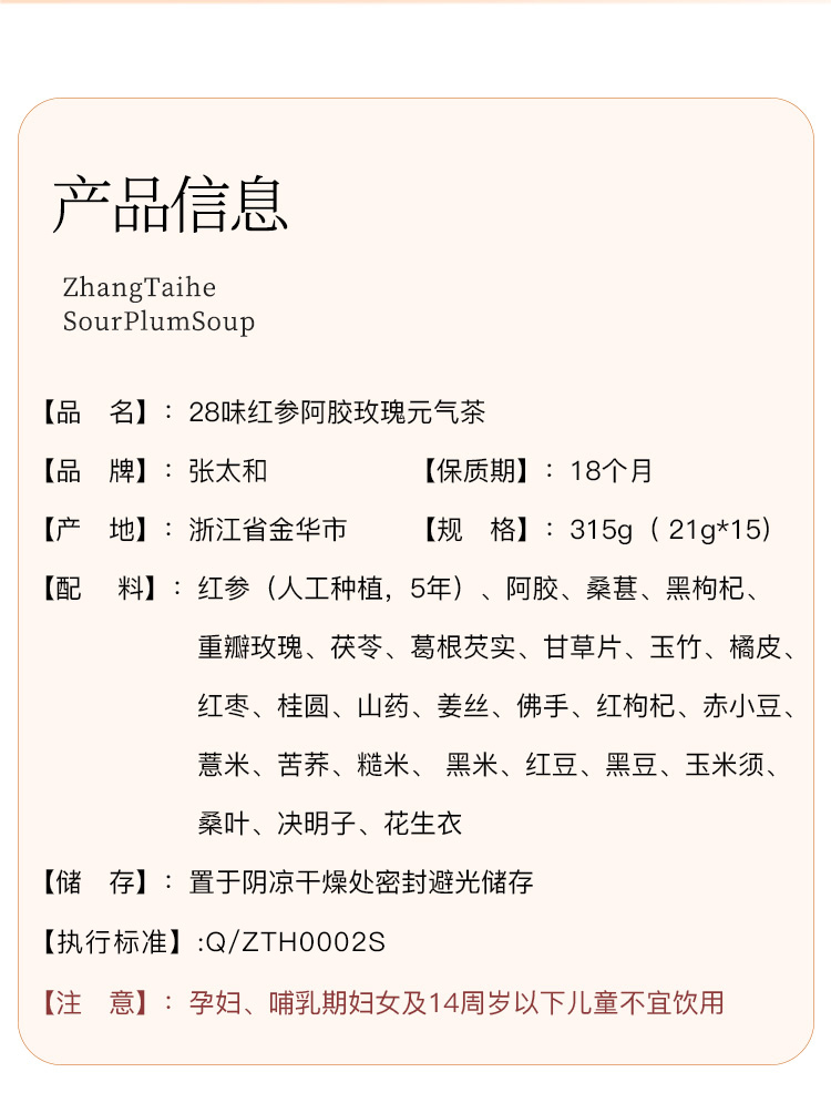 张太和 红参阿胶玫瑰元气茶315g(21g*15)
