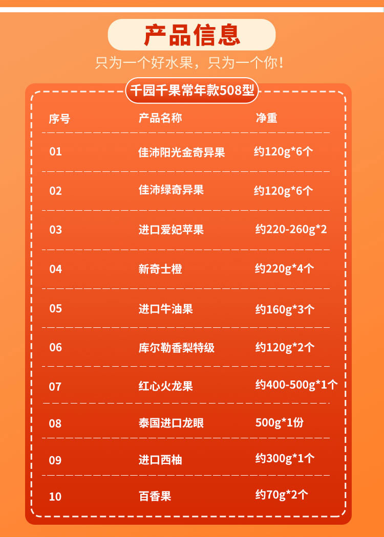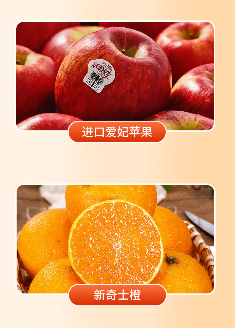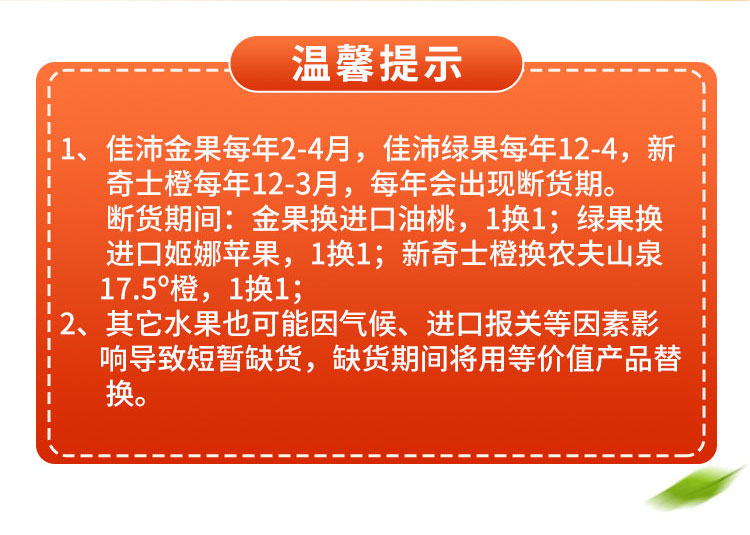 佳沛金果每年2-4月,佳沛绿果每年12-4,新奇士橙每年12-3月,会出现断货期。断货期间佳沛绿果替换为:进口姬娜苹果约160g/个;佳沛金果换:智利进口油桃约180-200g/个,新奇士橙换农夫山泉17.5º橙220-250g/个 发货