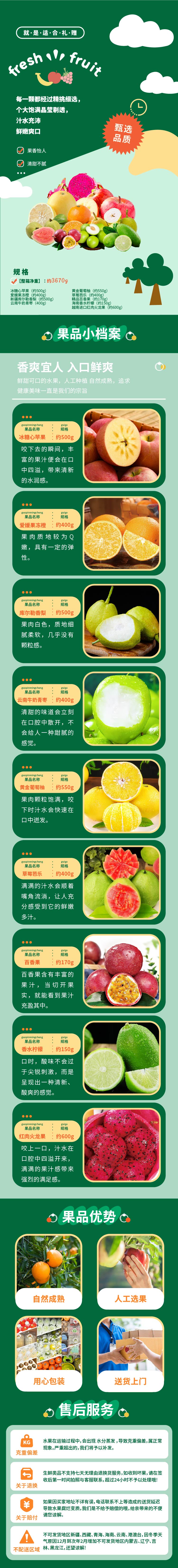 1、口感全,风味足:含脆甜苹果、爆汁果冻橙、清甜库尔勒梨等 9 种口感,甜、酸、鲜风味齐,满足不同偏好。