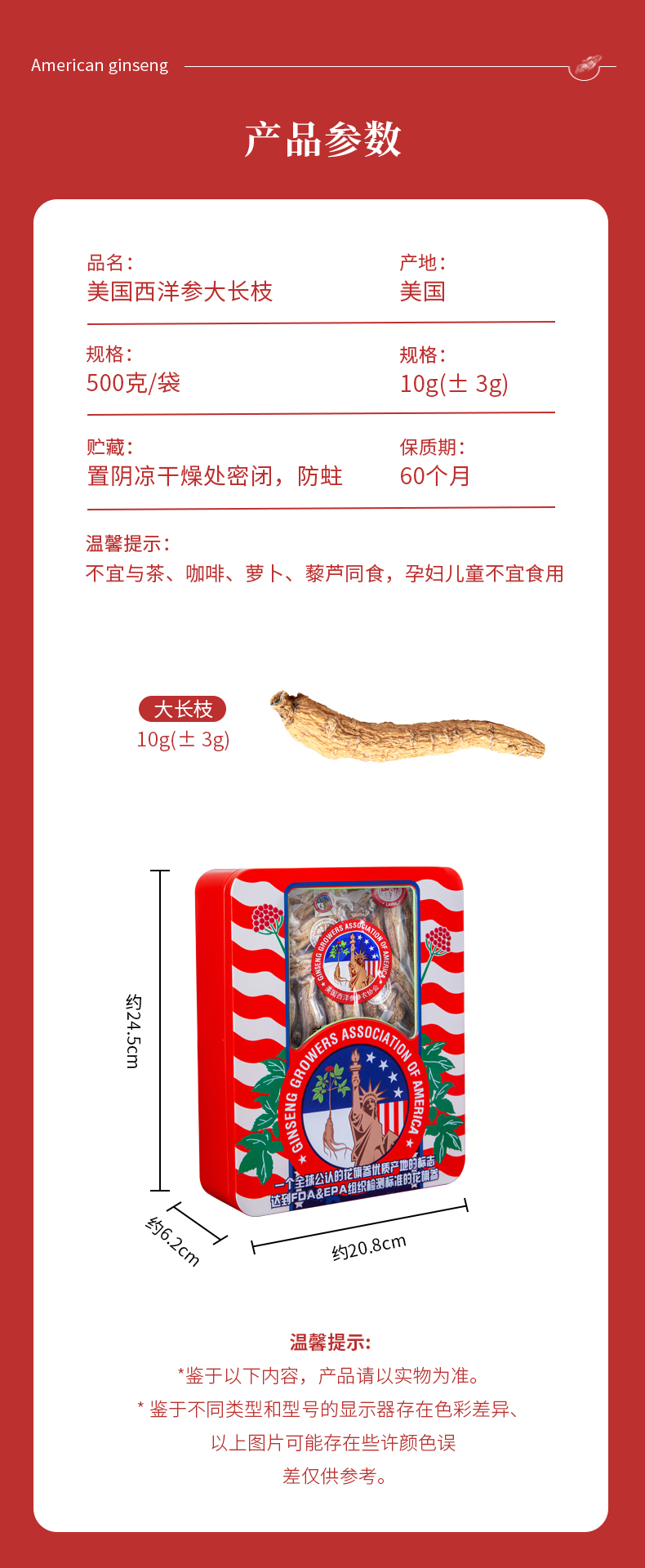 美国西洋参参农协会大长枝10g(±3g)500克/盒