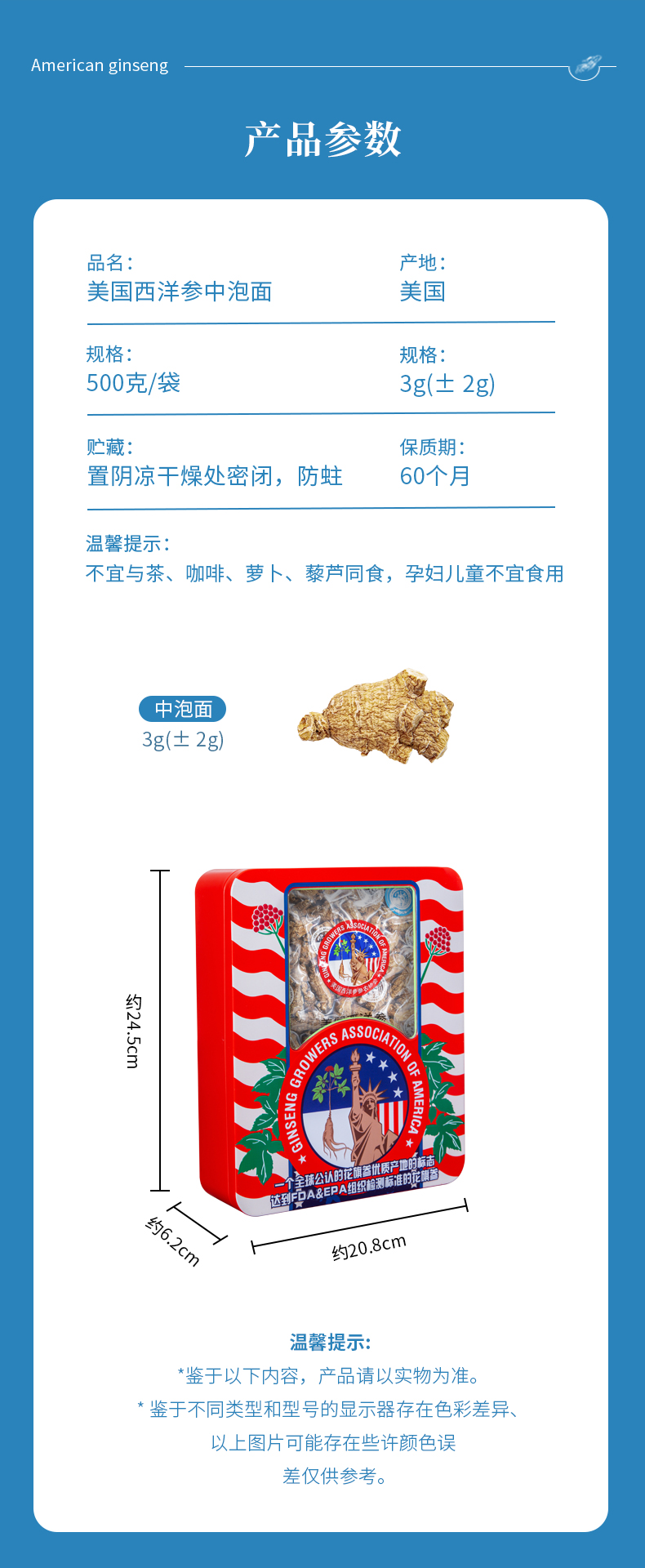 美国西洋参参农协会中泡面3g(±2g)500克/盒