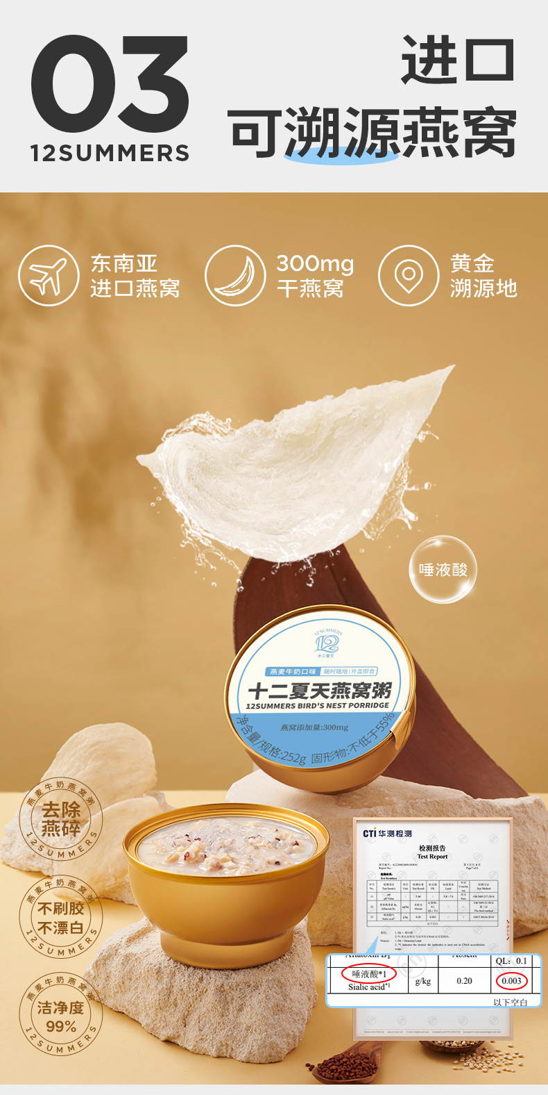 1.高膳食纤维搭配富含优质蛋白质和钙质的牛奶,补钙同时还能增强免疫力,内含丰富谷物,营养燕窝,口感有层次有嚼劲 2.低脂肪,低热量,高营养。3.配料纯粹不额外添加,0色素,0防腐剂,保留食材本味与营养,真材实料开盖可见。独立包装方便便携。