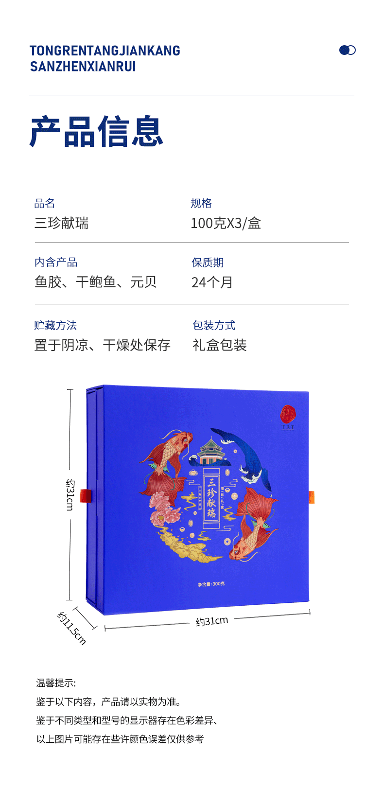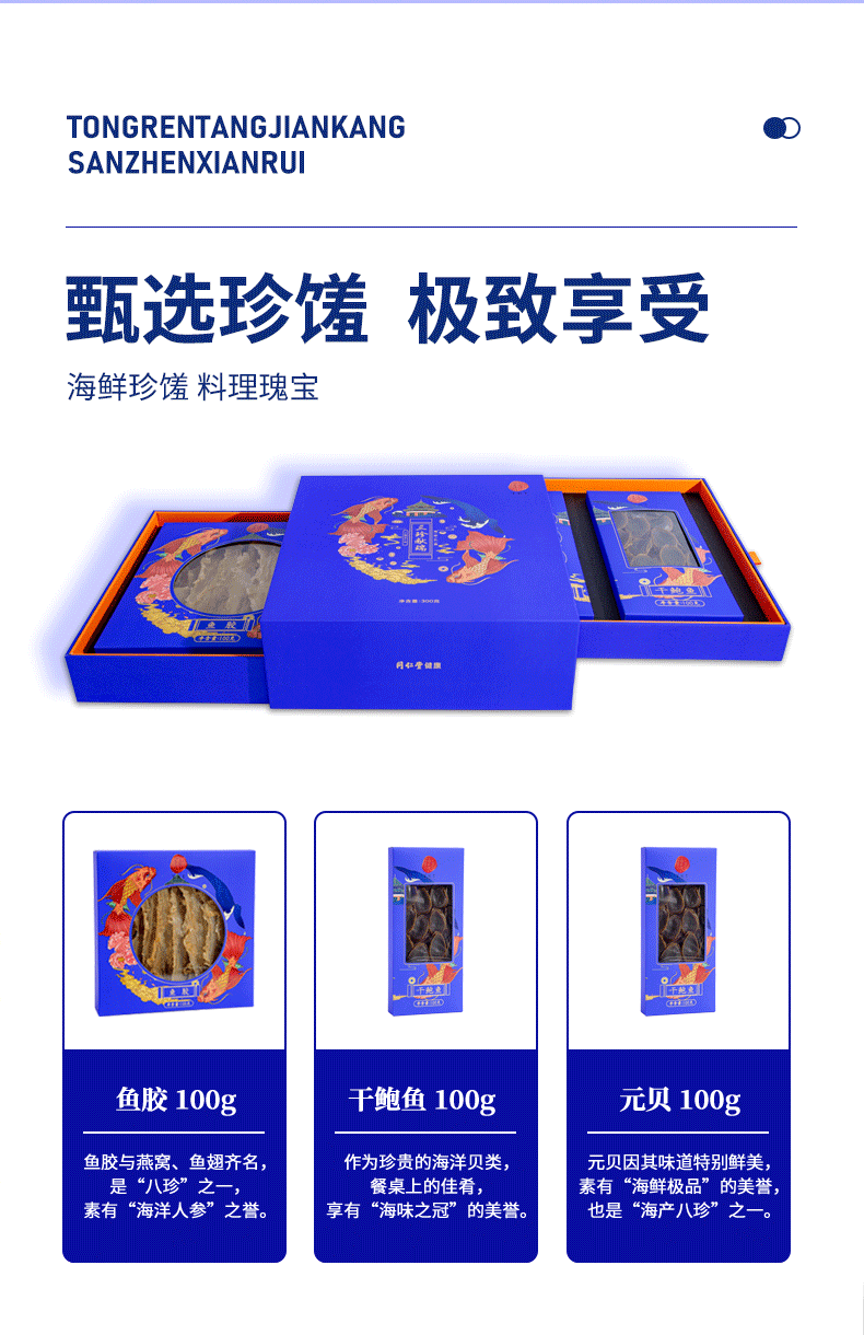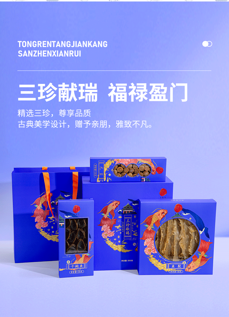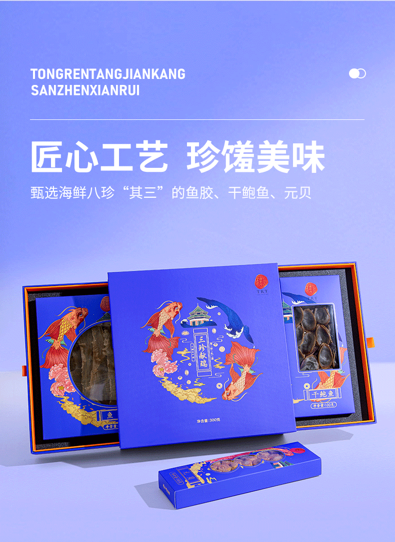 北京同仁堂三珍献瑞300克(元贝100克、鱼胶100克、干鲍鱼100克)