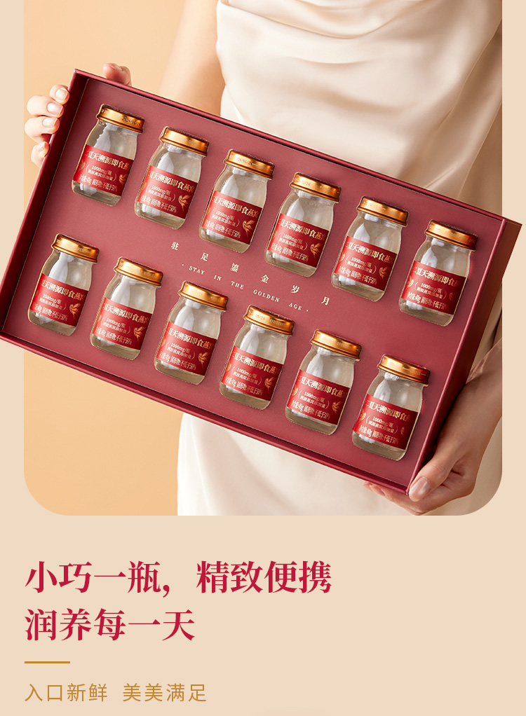 每一瓶即食燕窝均配有中国检验检疫科学研究院认证的CAIQ溯源码,这不仅是对其“合法身份”的证明,更是对原料进口安全和纯粹性的坚定承诺。礼盒设计典雅精致,红色基调配以暗纹与烫金工艺,彰显品牌的低调奢华与优雅。无论是自用还是馈赠亲友,都能传递出满满的尊贵与心意。内嵌独立瓶装燕窝,一盒12瓶,每瓶蕴含1000mg印尼溯源进口燕窝,固形物含量高达50%以上,真材实料,每一口都能感受到燕窝的细腻与浓郁。