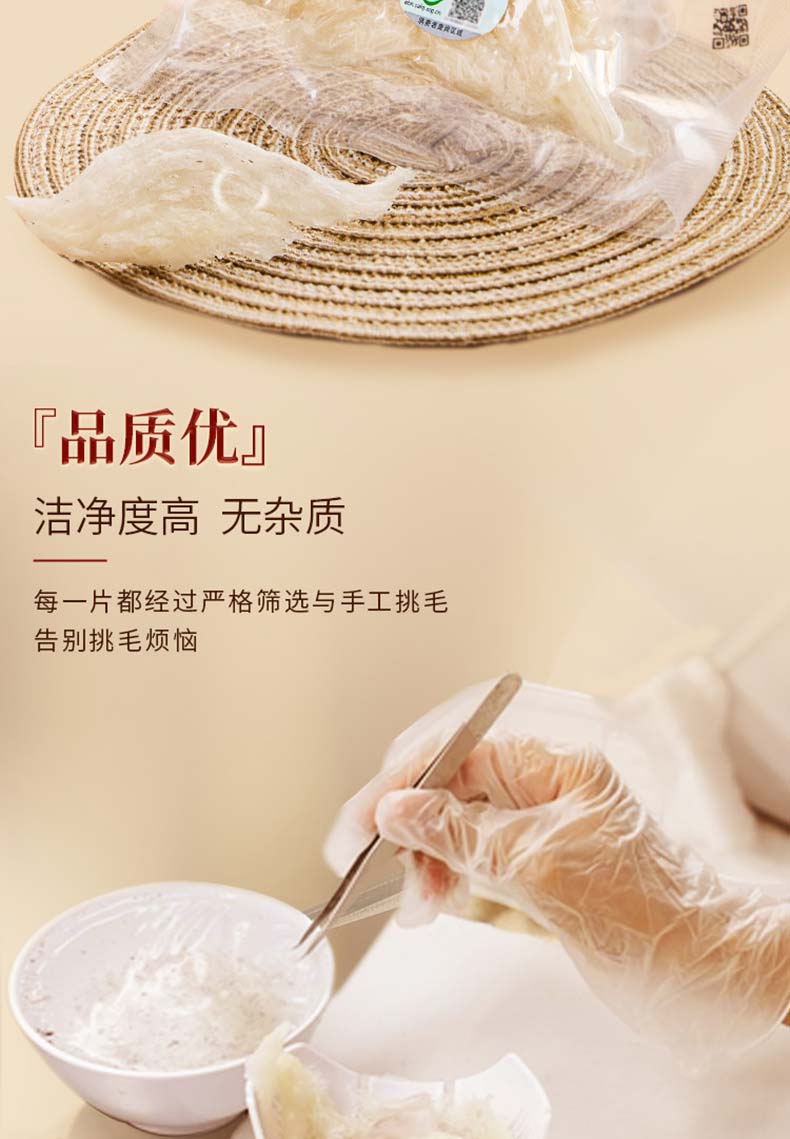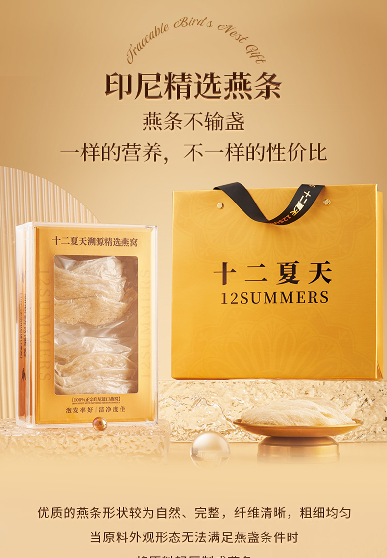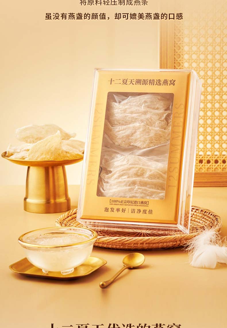 每片燕盏都源自印尼与马来西亚的自然馈赠,我们承诺,每一盏燕窝均为原产地直采,严格遵循自然法则,拒绝任何化学干预——0刷胶、0漂白、0添加,纯粹如初,100%纯天然品质保证。中国检验检疫科学研究院溯源码认证,一盏一码,每一盏都有独一无二的合法身份证,溯源保障、安心滋补。泡发出后的燕窝晶莹剔透、燕丝分明。
