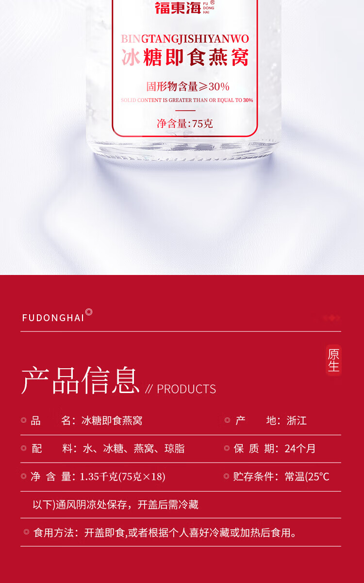 【福东海-特渠】冰糖即食燕窝1.35千克(75克x18瓶)--固形物30%
