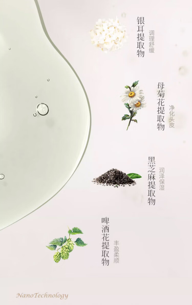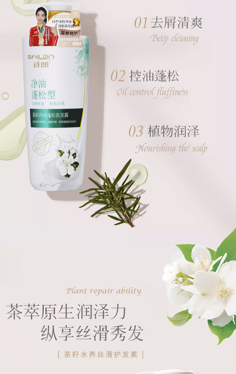 含有茶籽提取物,能够温和去除头皮上的油脂和污垢,彻底清洁头发和头皮,使头发清爽不油腻。