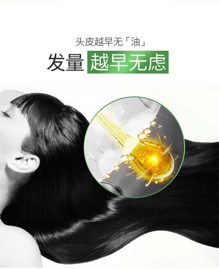 富含甘草、侧柏叶、女贞子植物原液萃取精华,控油去屑,洁净头皮环境,解决致脱因素,补充毛囊营养,修护失衡头皮
