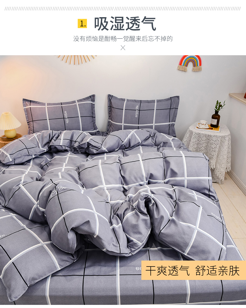 舒适的面料,亲肤又透气,在夜晚给你最温柔的守护!躺上去,钻进被窝,就像被轻轻柔柔包裹着的感觉,触感软滑,十分亲肤细腻,一觉睡到天亮。小清新印花四件套面料厚实,做过缩水处理,面料挺括弹性强。一套的价格,两套享受,随你的心情自由切换!