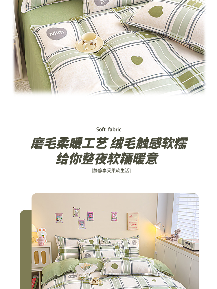 舒适的面料,亲肤又透气,在夜晚给你最温柔的守护!钻进被窝,就像被轻轻柔柔包裹着的感觉,触感软滑,十分亲肤细腻。拥抱这套磨毛四件套,就像投入了云朵的怀抱。在这个季节,给床铺添上一份温暖的守护,加厚不是为了隔离寒冷,而是为了拥抱舒适的冬日暖阳,每一根细丝都经过磨毛处理磨毛四件套面料厚实,做过缩水处理,面料挺括弹性强。