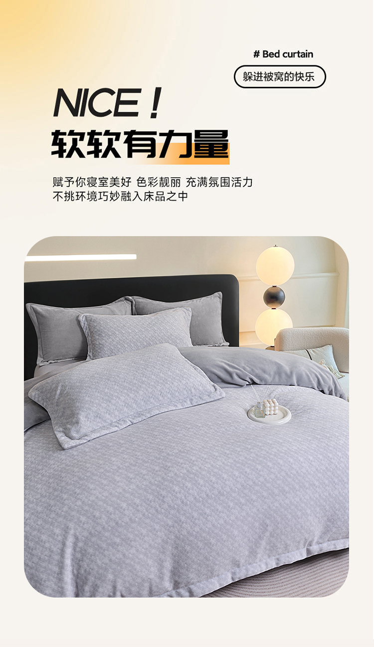 采用100%聚酯纤维面料,经过特殊拉绒工艺处理,绒面蓬松厚实,形成空气隔热层,有效锁住体温,抵御寒冬冷气,让被窝整夜温暖如春,告别手脚冰凉。聚酯纤维结构紧密但透气性佳,搭配蜂窝状织法,既保证保暖性又避免闷热感,湿气快速排出,减少夜间出汗粘腻,舒适度远超传统法兰绒。材质抗皱免熨,久用不易变形起球,机洗后仍能保持蓬松柔软;防静电处理减少毛发灰尘附着,秋冬换季收纳方便,省心更省力。无荧光剂、无甲醛,敏感肌可安心使用;加厚床笠款贴合床垫不移位,被套四角绑带固定被芯,保暖不钻风。寒冬御寒必备——高性价比的聚酯纤维绒套件,用科技温暖替代厚重压迫感,让冬季睡眠质量提升50%!