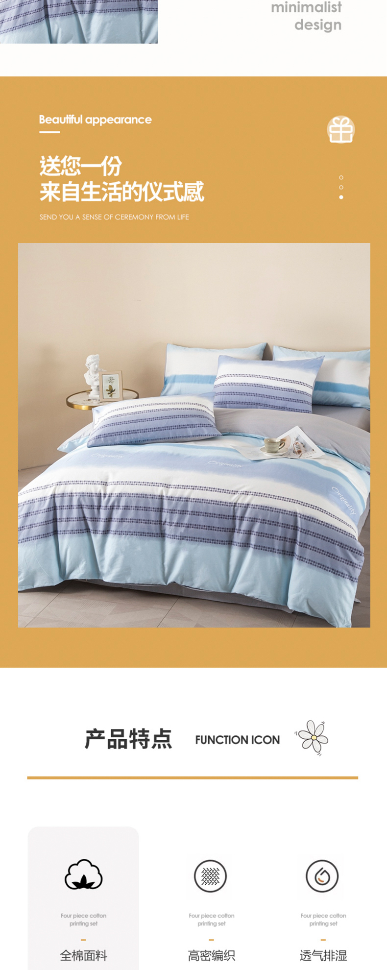 100%全棉材质,阳光全棉,40支纱倾心织造,触感柔软舒适,体感细腻亲肤 ,透气性优越,美观耐用,深受人们的喜爱。