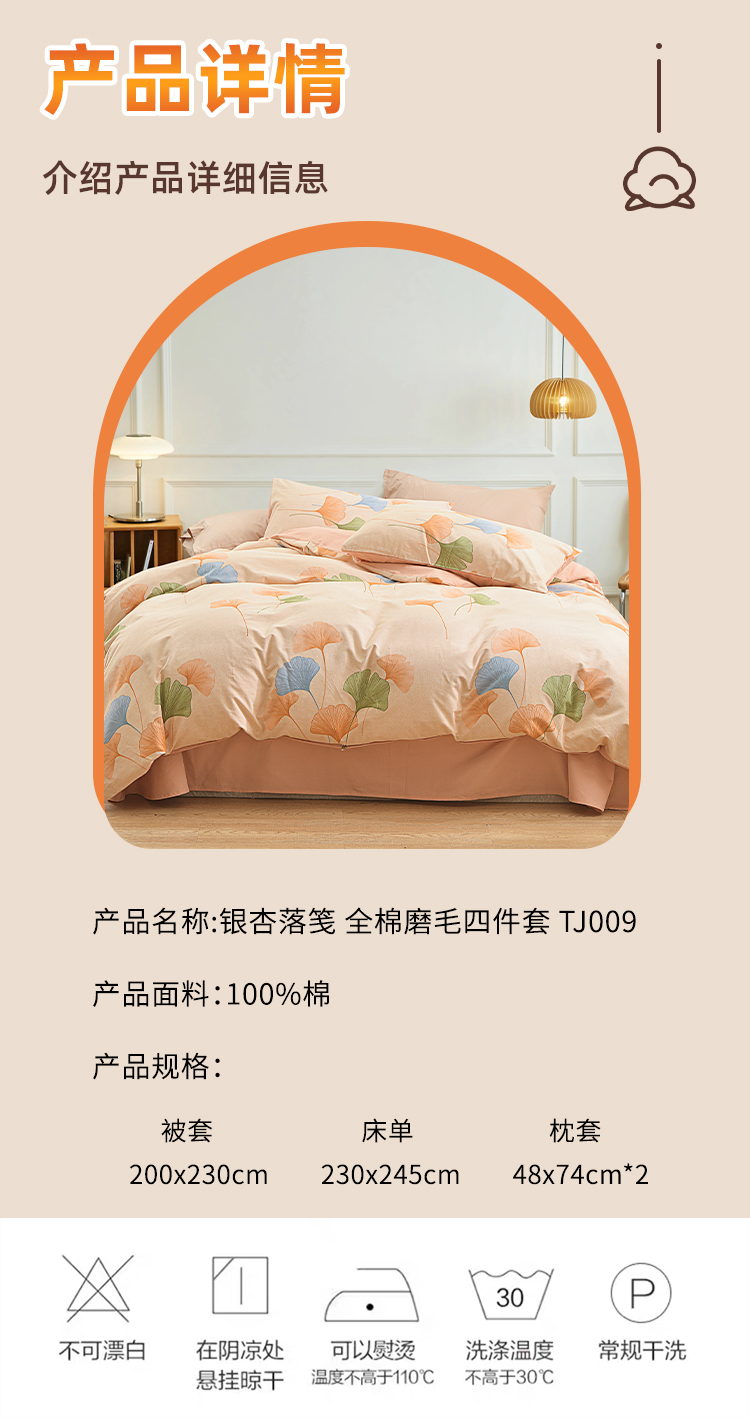 银杏落笺全棉磨毛四件套以自然美学与实用科技为核心,打造「会呼吸的温暖」睡眠体验。精选100%优质棉,经双面磨毛工艺形成细腻绒层,触感如初雪融化般绵软,秋冬裸睡不凉肤,春夏透气不闷汗。设计上提取银杏叶脉纹理,采用活性印染工艺呈现渐变暖棕色调,搭配隐线包边细节,既保留自然野趣又彰显现代极简格调。被套被角带设计防移位,经多次水洗测试仍保持柔软如新,让每一夜都沉入银杏色的温柔梦境。