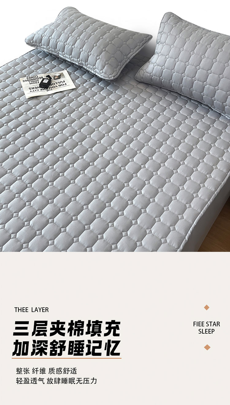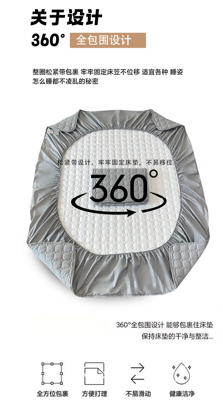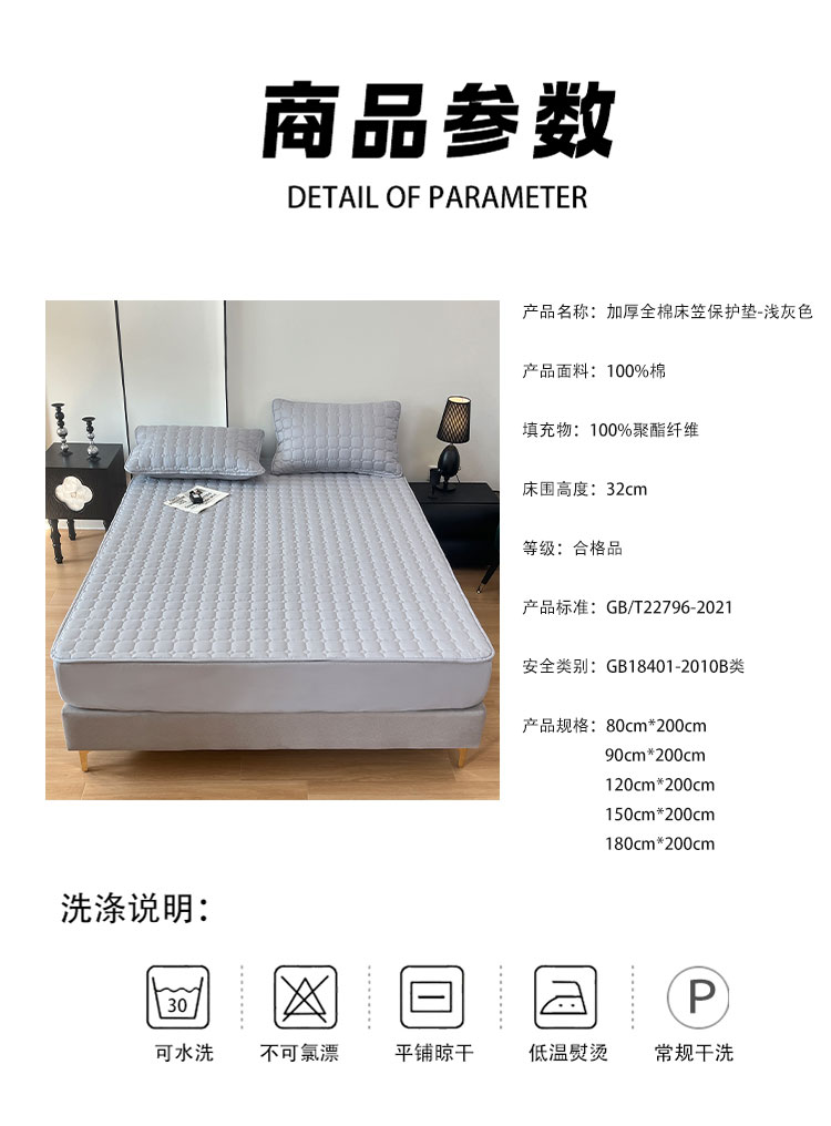 采用优质全棉面料,触感柔软细腻,亲肤性极佳,可抑制螨虫滋生,对敏感肌肤友好。天然棉材质透气吸汗,能保持睡眠环境干爽,避免闷热潮湿,提升睡眠舒适度。床笠式360°全包围设计,整圈松紧带包裹,稳固不移位,有效阻挡灰尘、污渍、油渍等侵入床垫,日常的饮品泼洒、灰尘堆积都能被床笠隔离,减少床垫清洁负担。32厘米加高床围,适用绝大多数床垫,轻松包裹无压力。