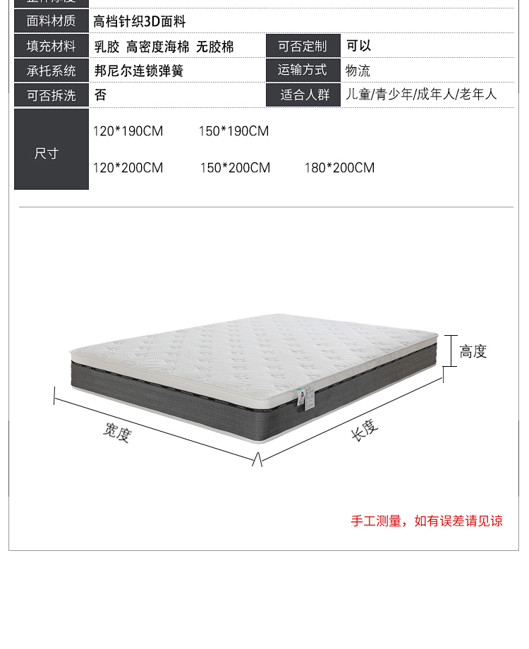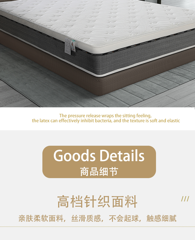 采用天然乳胶材质,柔软亲肤,贴合人体曲线,分散压力,带来云端般的舒适睡感。静音邦尼尔连锁弹簧强力支撑设计,精准支撑身体各部位,有效缓解颈椎、腰椎压力。透气性极佳,蜂窝状结构促进空气流通,保持干爽。高弹性材质经久耐用,抗变形能力强,静音效果出色,翻身无噪音干扰。无论是上班族、老年人还是儿童,都能享受健康深睡体验。环保工艺,无有害添加,搭配人体工学设计,让每晚睡眠都成为身心放松的治愈之旅。