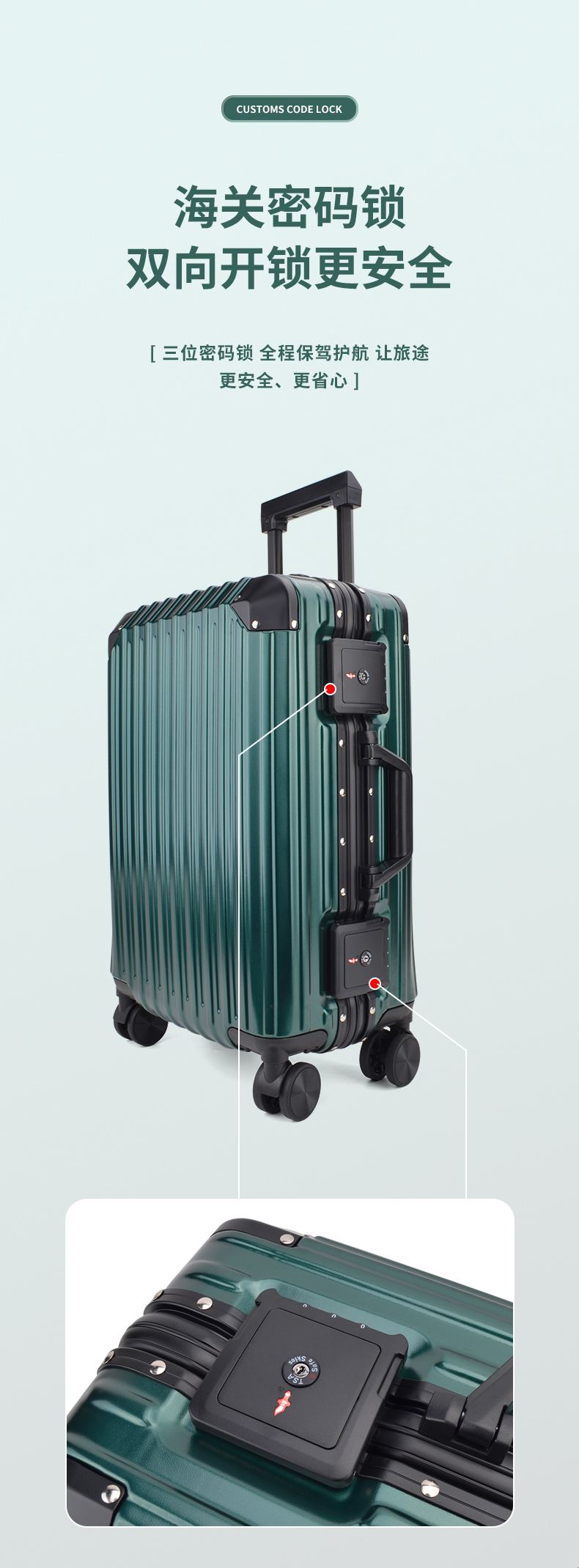 主料采用PC合金材质,上方四面防撞包角设计,精细加厚铝合金边框,三位海关锁密码锁,自动回弹双提手,铝镁合金拉杆更坚实耐用,里布采用拉链撞色设计,新颖时尚,多收纳隔层设计,X型固定织带